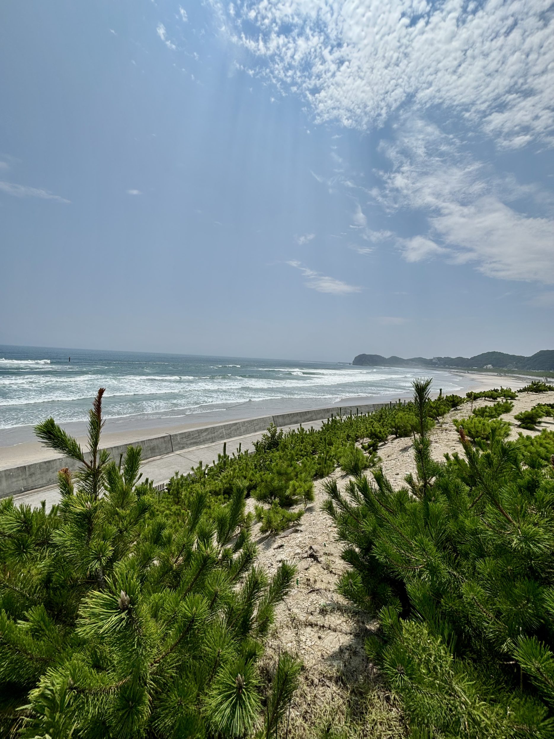 福島県いわき市の豊間防災緑地に行きました。サーファーが海にたくさん浮いています。